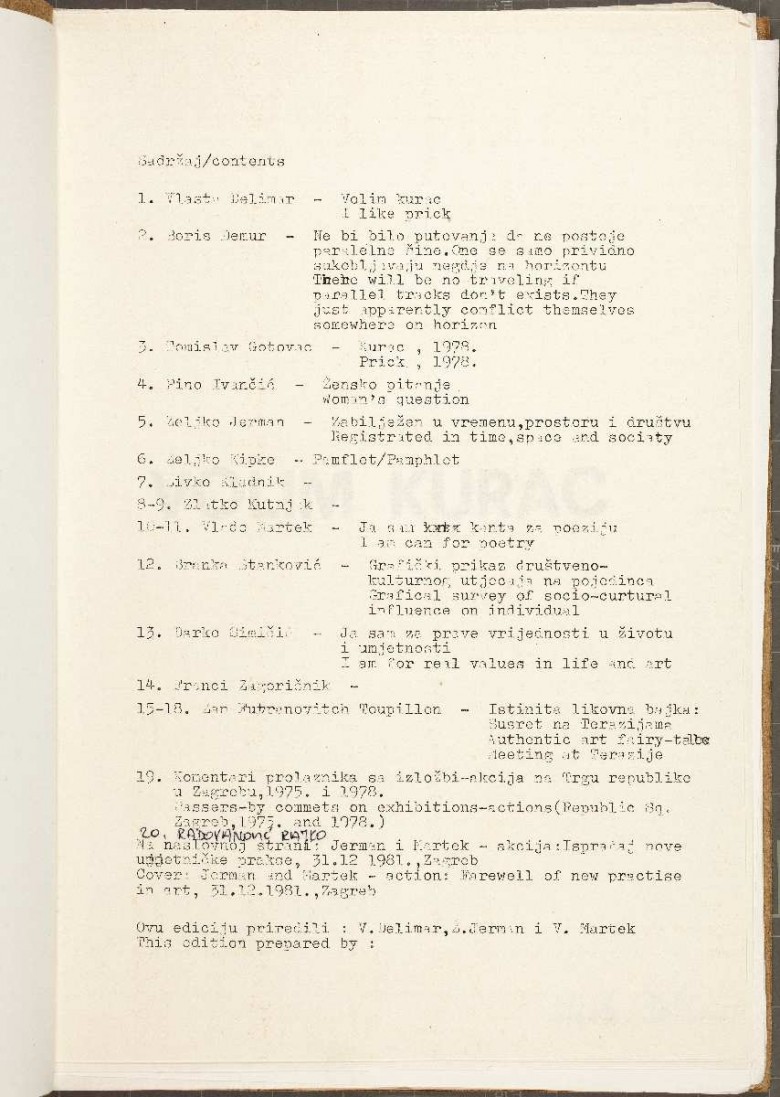Maj 75, number H, 1982; Tomislav Gotovac, Boris Demur, Željko Jerman, Vlado Martek, Željko Kipke, Zlatko Kutnjak, Vlasta Delimar, Darko Šimičić, Pino Ivančić, Marijan Molnar, Živko Kladnik, Branka Stanković, Franci Zagoričnik, Zan Futranovitch Toupillon, Rajko Radovanović